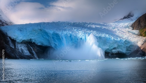 A scene where a glacier collapses due to global warming, causing huge ice blocks to fall