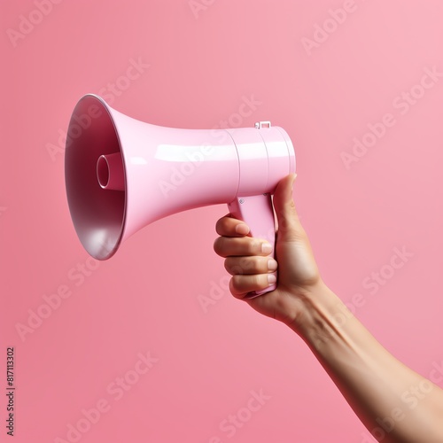 A scene with a hand holding a megaphone, emphasizing communication and attention on a pink background.