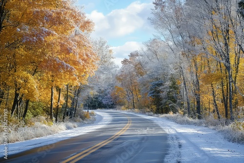 A scenic drive through an autumn wonderland, frost lightly coating the roadside trees.