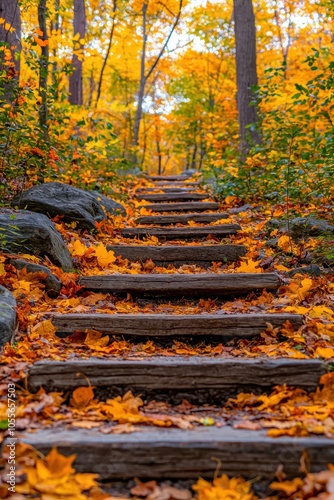 A scenic path of wooden steps surrounded by vibrant autumn leaves, creating a tranquil atmosphere in the colorful forest.