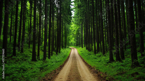 A scenic pathway through a lush green forest lined with tall trees and vibrant foliage.