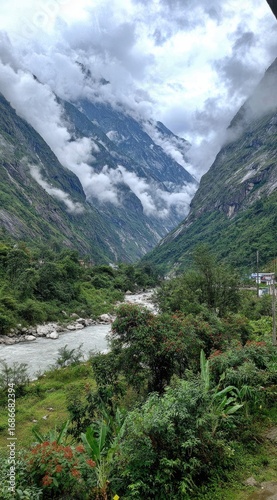 A scenic view of lush valley with a winding river, framed by towering mountains shrouded in mist and clouds under an overcast sky