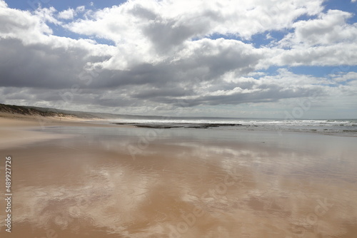 A scenic view on the beach with clouds and reflections.