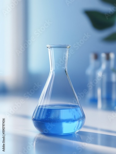 A Science Beaker in the laboratory on a table white and light blue background.. laboratory equipment out of focus.