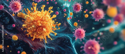 A scientific illustration of a virus observed under a microscope, surrounded by aggressive bacteria, capturing the essence of microbial warfare against disease