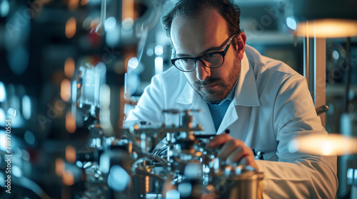A scientist conducting experiments in a physics lab, manipulating equipment to observe and analyze fundamental physical phenomena. The precision and complexity of the experiments a