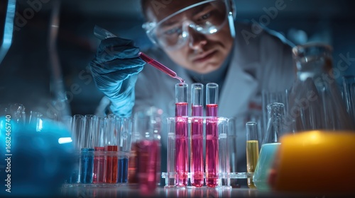 A scientist conducts experiments in a laboratory, carefully mixing colorful liquids in test tubes.