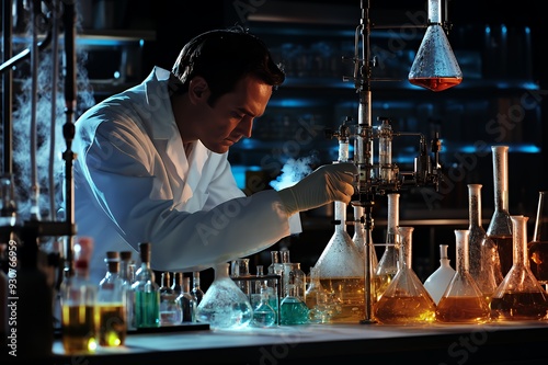 A scientist conducts experiments in a laboratory filled with various colorful chemical solutions.