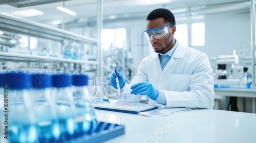 A scientist conducts experiments in a laboratory setting with equipment and glassware.