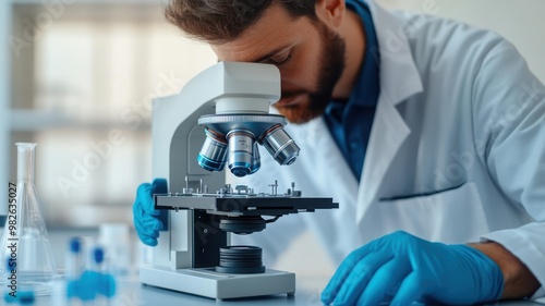 A scientist examines samples through a microscope in a modern laboratory, showcasing scientific research and innovation.