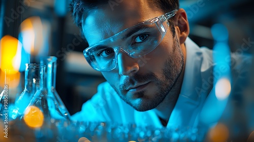 A scientist, focused and determined, works with glassware in a lab bathed in blue light.