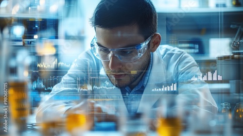 A scientist in a lab, analyzing data with various glassware and digital overlays.