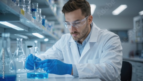A scientist in a lab coat and gloves conducts an experiment with blue liquid in a modern laboratory setting.