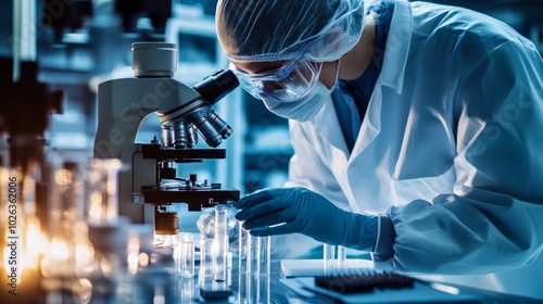 A scientist in a lab coat and protective gear examines a sample under a microscope.