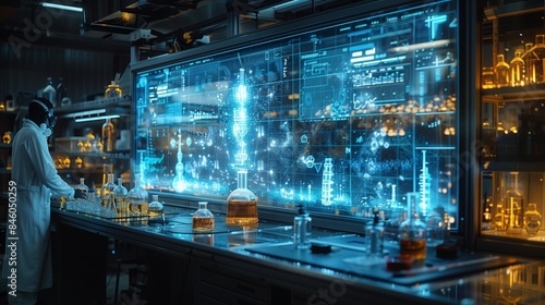 A scientist in a lab coat conducts virtual experiments in a futuristic chemistry lab equipped with a holographic display.