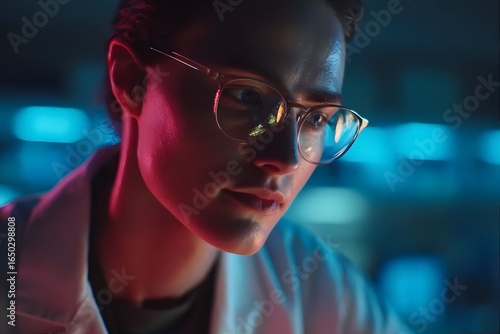 A scientist in a lab, illuminated by blue and red lights, focusing on a task.