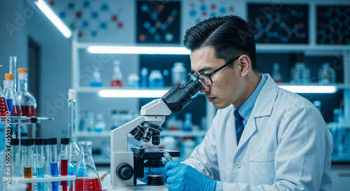 A scientist in a white lab coat and blue protective gloves peers into a microscope in a brightly lit laboratory.