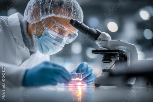 A scientist in protective gear carefully analyzes a specimen under a microscope, contributing to ongoing research in the lab Generative AI