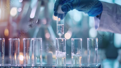 A scientist is pouring a liquid into a glass beaker