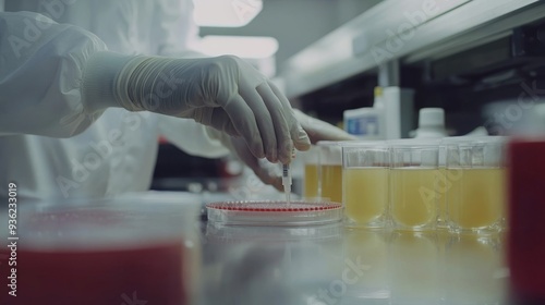 A scientist is working in a lab with a tray of test tubes and a syringe