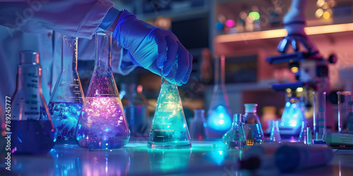 A scientist is working in the laboratory, holding blue liquid and making handmade glass flasks on the table with other scientific equipment around him.