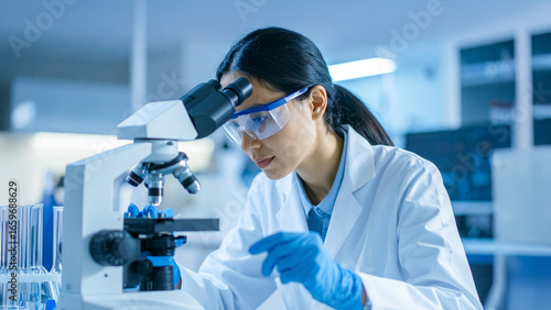 A scientist observing through a microscope in a laboratory. The scene captures the essence of scientific discovery and analysis.