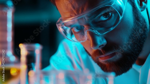 A scientist wearing a lab coat and goggles conducting an experiment, surrounded by glassware and chemical solutions, Laboratory environment