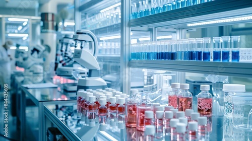 A scientist wearing a lab coat is working in a laboratory. They are surrounded by shelves of chemicals and equipment. The scientist is looking at a microscope.