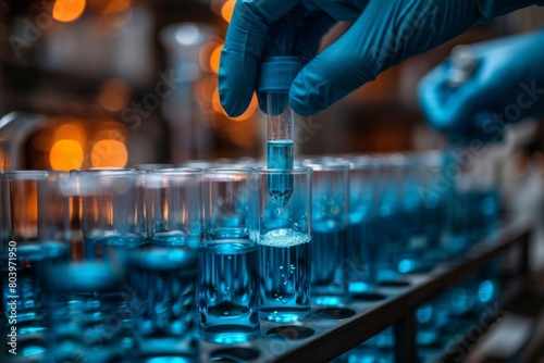 A scientists gloved hand holding a test tube, with a rack of chemical-filled flasks in the foreground.