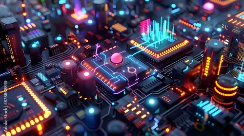 A sci-fi electronic circuit board with holographic elements, pulsating multicolored lights, and floating, transparent components, all set in a dark, futuristic environment