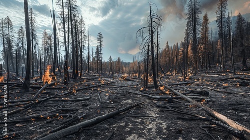 A scorched earth landscape with blackened trees and ashen ground, showing the stark aftermath of a forest fire's destructive path.