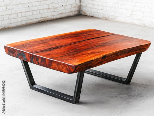 A sculptural coffee table featuring polished reclaimed wood and a base of recycled steel