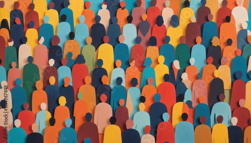 A sea of colorful, faceless figures representing a large crowd gathered together at an outdoor setting, possibly symbolizing diversity or unity in a group