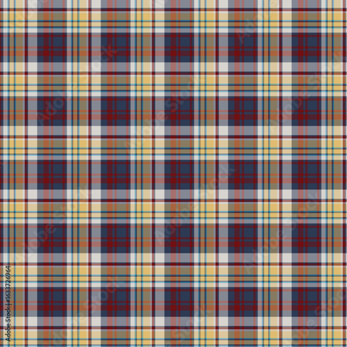 A seamless blue plaid tartan fabric pattern with a checkered green and pink geometric design