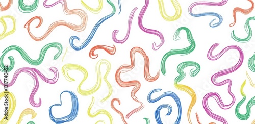 A seamless pattern featuring colorful, simple line drawings of small squiggles and swirls on a white background
