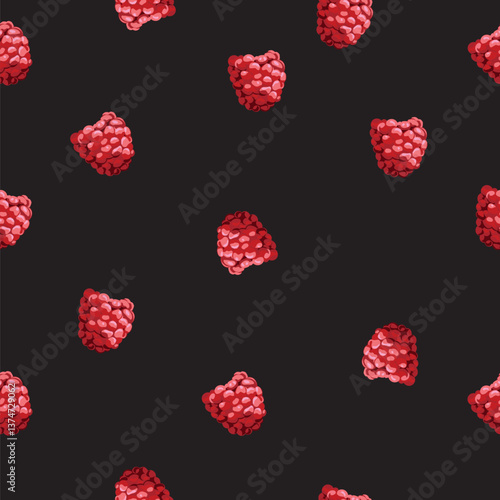 A seamless pattern featuring vibrant raspberries and green leaves on a light background