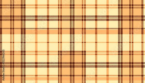 A seamless pattern of beige and brown plaid. The image features intersecting lines creating a checkered textile texture ideal for backgrounds."