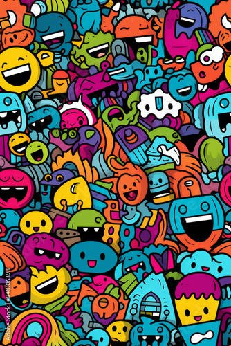 A seamless pattern of happy, colorful, cartoon characters and doodles.