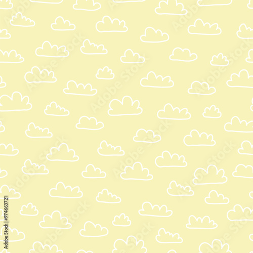 A seamless pattern of simple, outlined clouds on a soft yellow background, ideal for design projects.
