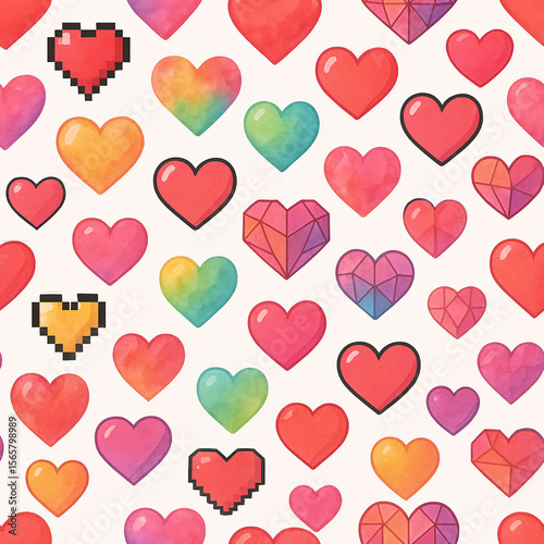 A seamless pattern of various heart designs in different colors and styles on a white background