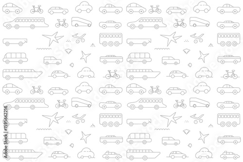 A seamless pattern of various transportation vehicles including cars buses airplanes and bicycles in gray lines
