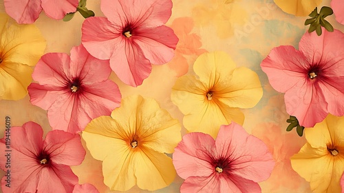 A seamless vintage 1950s wallpaper pattern featuring petunias layered with a retro starburst overlay, vibrant pastel tones of pink and yellow, subtle fabric texture, symmetrical floral arrangements,