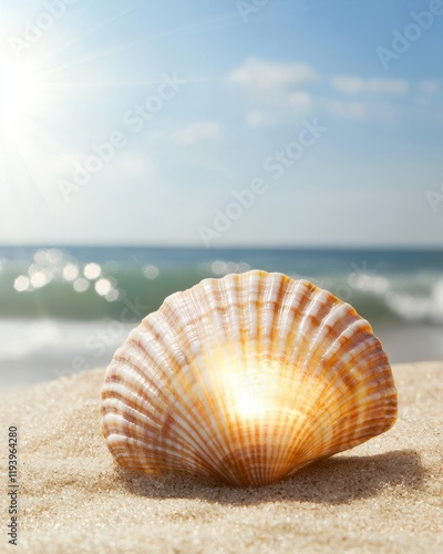A seashell glistens on sandy beach with ocean waves and sunlight in the background.