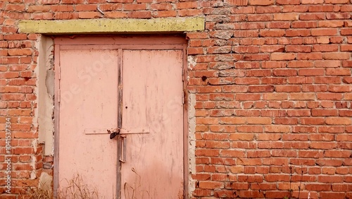 a section of a brick wall with a closed wooden door. The door is painted in a faded pink color and appears to be old and weathered. It is secured with a metal latch and has a horizontal wooden beam ac