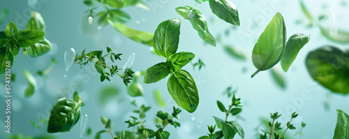 A selection of fresh herbs, including basil, mint, and rosemary, floating in the air, creating an aromatic and visually appealing composition.