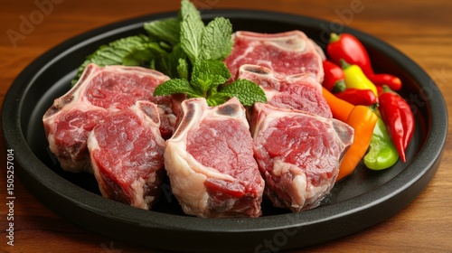A selection of fresh lamb chops displayed on a dark plate, garnished with fresh mint and a side of colorful peppers for an appetizing presentation.
