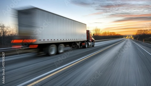 A semi truck is driving down a road with a sunset in the background. The truck is moving quickly, and the sky is filled with clouds