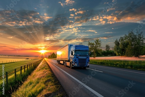 A semi-truck driving down a highway at sunset, with a beautiful sky and landscape in the background