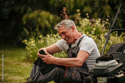 A senior man in a working suit sitting, having a video call, and taking a break after working in his garden.