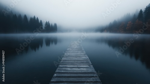 A serene and atmospheric image of a wooden pier stretching into a misty, foggy lake surrounded by trees, capturing tranquility and the beauty of nature's silence.